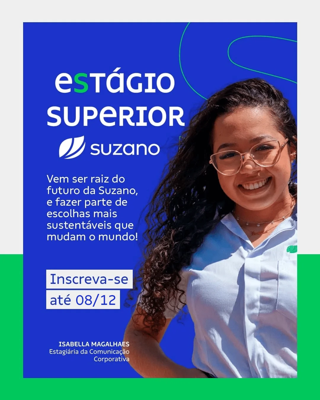 Com uma estrutura pensada para cultivar o desenvolvimento de cada talento, o Programa de Estágio Superior da Suzano tem duração de até 2 anos, com possibilidade de efetivação.